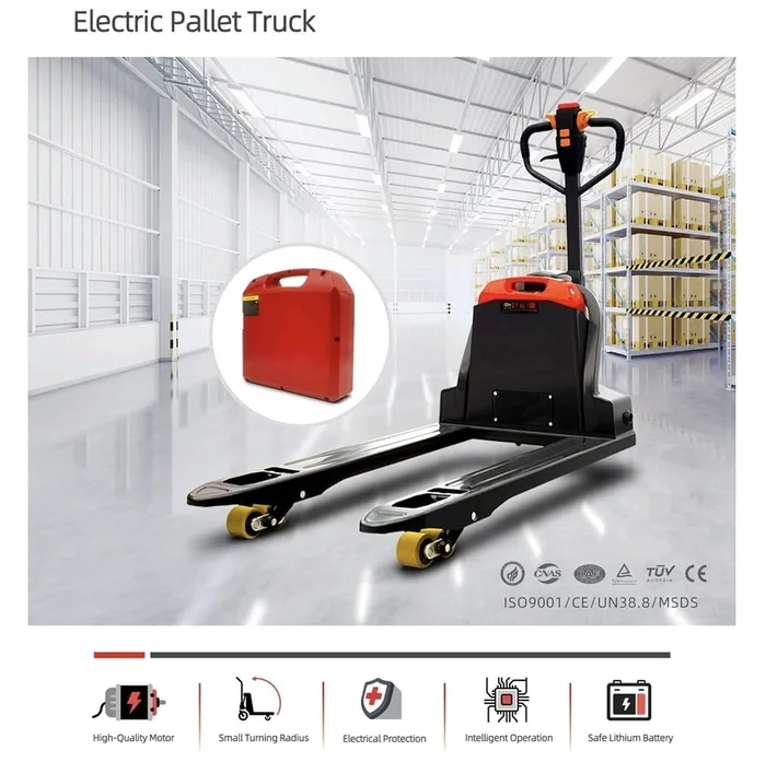 עגלת משטחים חשמלית מלאה 1.5-טון, סוללת ליתיום 24V 20Ah נשלפת לטעינה ביתית או להחפה.